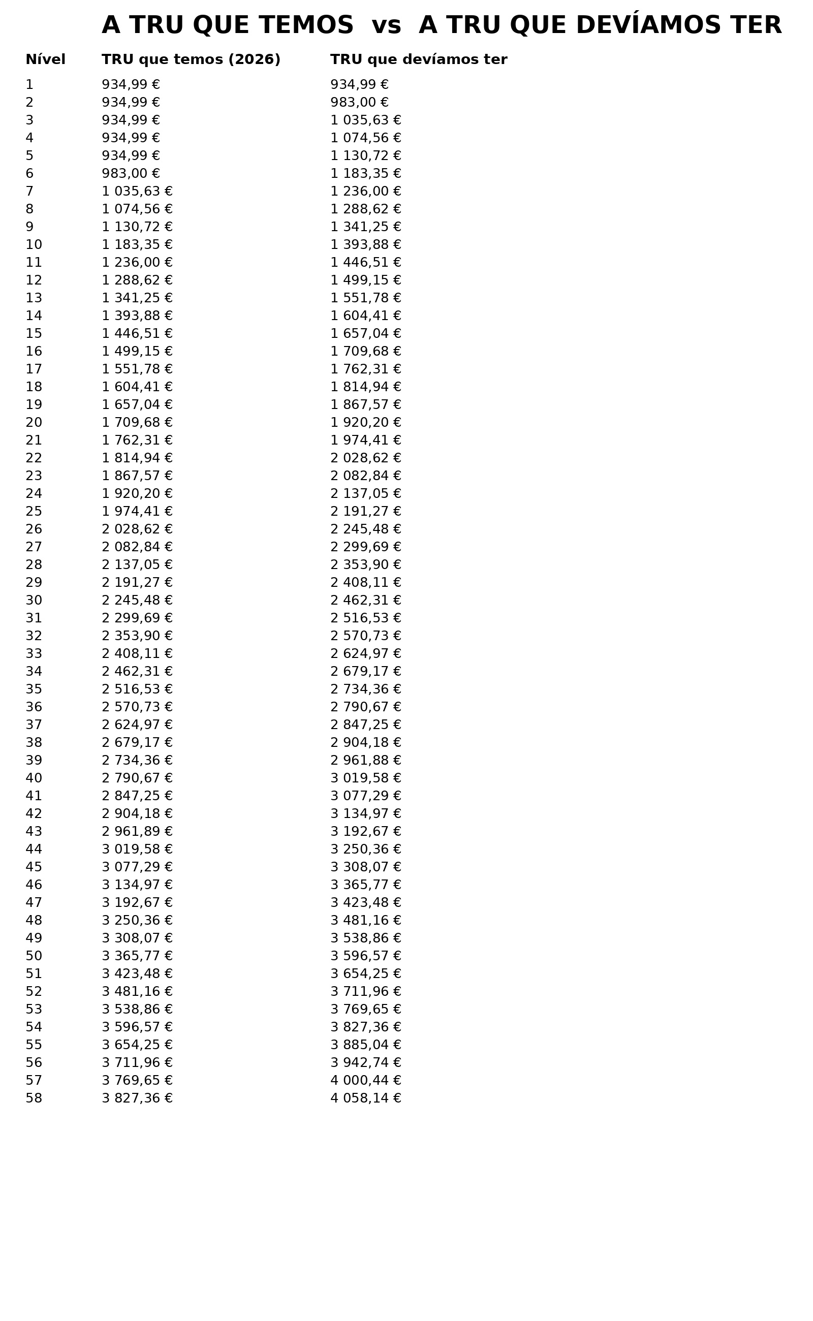 A Tabela Remuneratória Única está profundamente degradada e desvirtuada. O Governo mantém artificialmente vários níveis salariais colados ao mínimo, violando a lógica da progressão e a própria estrutura da TRU de 2009. O valor da Base Remuneratória da Administração Pública (934,99 €) tem de corresponder apenas ao Nível 1, e não pode continuar a servir de tampão para os níveis 2, 3, 4 e 5, anulando carreiras, experiência e responsabilidade. O nível 2 tem de corresponder ao valor do atual nível 6, o 3 ao atual 7, o nível 4 ao atual nível 8 e o nível 5 atual tem de corresponder ao valor remuneratório do atual 9.